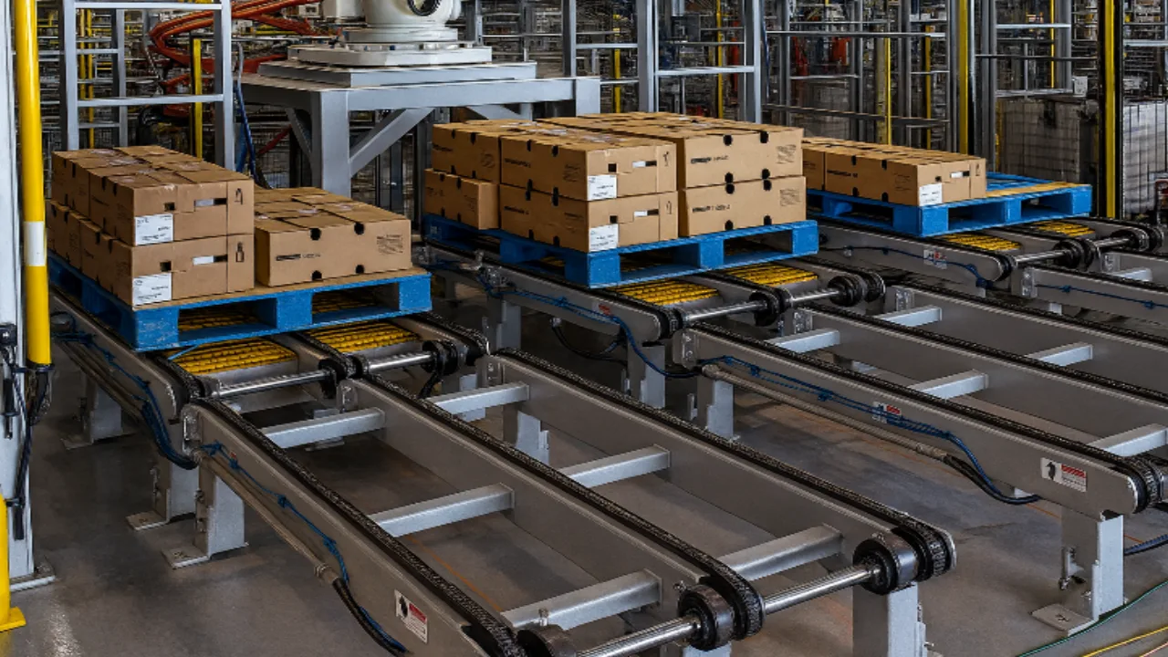 Heavy-duty steel chain-driven floor conveyor for robust transportation of pallets, heavy components and bulk materials in industrial environments